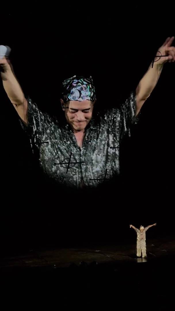 郭富城演唱完歌曲后,向台下观众比了一个大大的“爱心”,然后倒退往后走到升降台。
