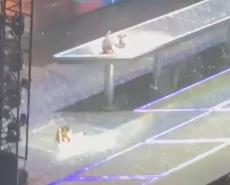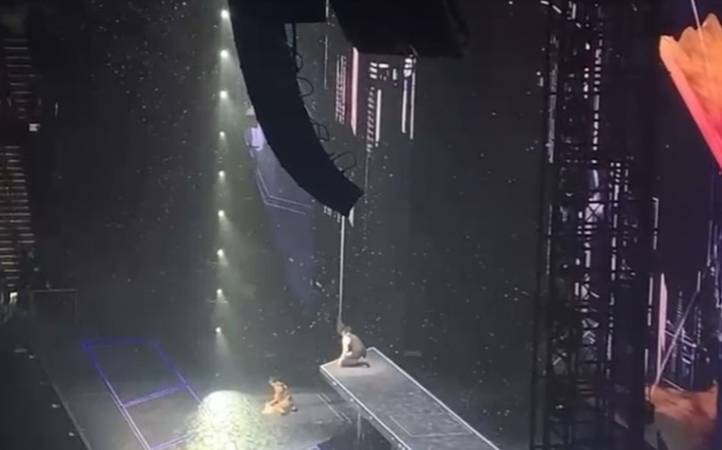 此时,城城没发现升降台“迟到”,他意外摔了下去,现场听见麦克风敲到舞台的声音,令在场歌迷担心尖叫。