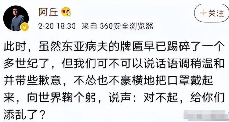然而,在这关键时刻,阿丘却发表了一番令人震惊的言论,他大言不惭地将疫情归咎于中国,并要求中国向世界道歉,甚至使用了“东亚病夫”,这样极具侮辱性的字眼。
