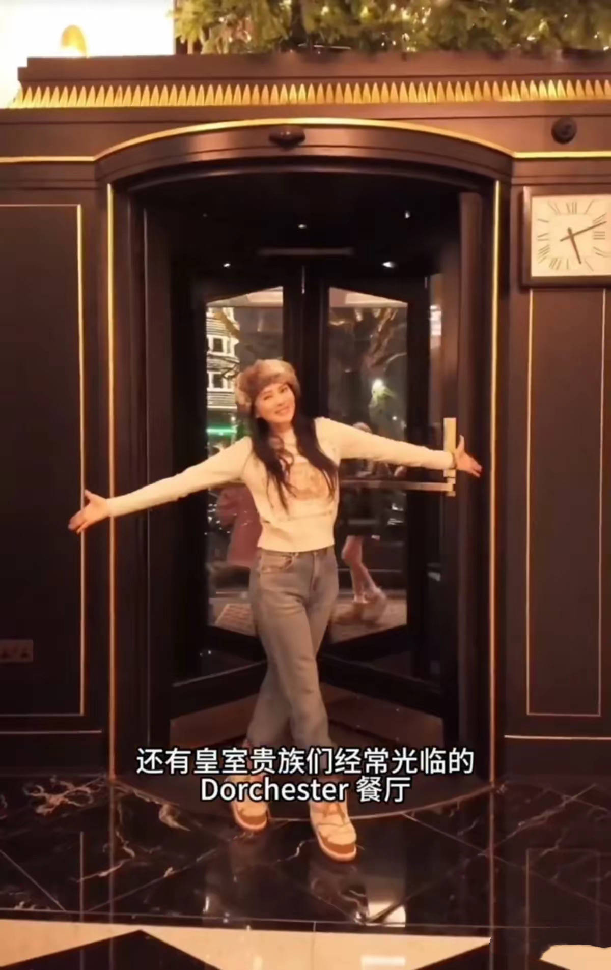 伊能静婆婆穿了一件新中式的外套,丝绒面料、刺绣印花的点缀,简单高级格外显贵。在华丽的背景下,婆婆不停的拍照。