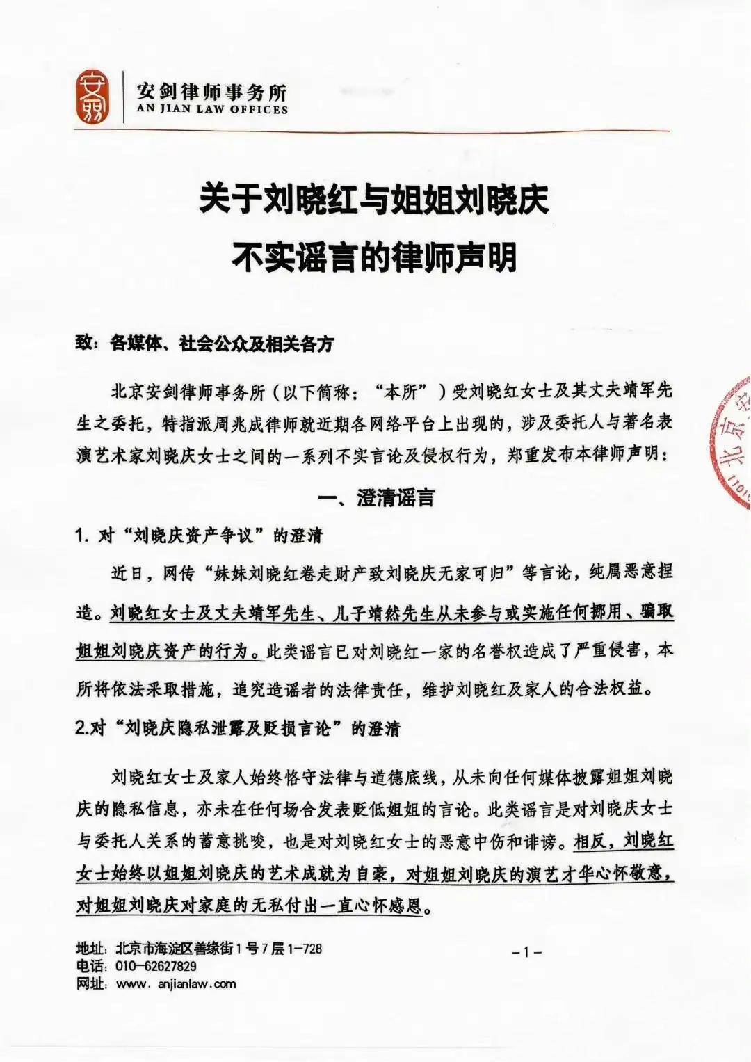 一、关于网上盛传妹妹卷走刘晓庆财产,导致她无家可归,这是恶意捏造,是毫无根据的谣言。刘晓红及丈夫靖军、儿子靖然将追究造谣者的责任。