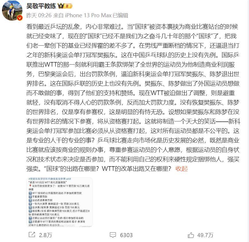 吴敬平对国乒队有感情,希望国球长盛不衰,看到最近乒坛的乱象,他心里急,才发长文炮轰。