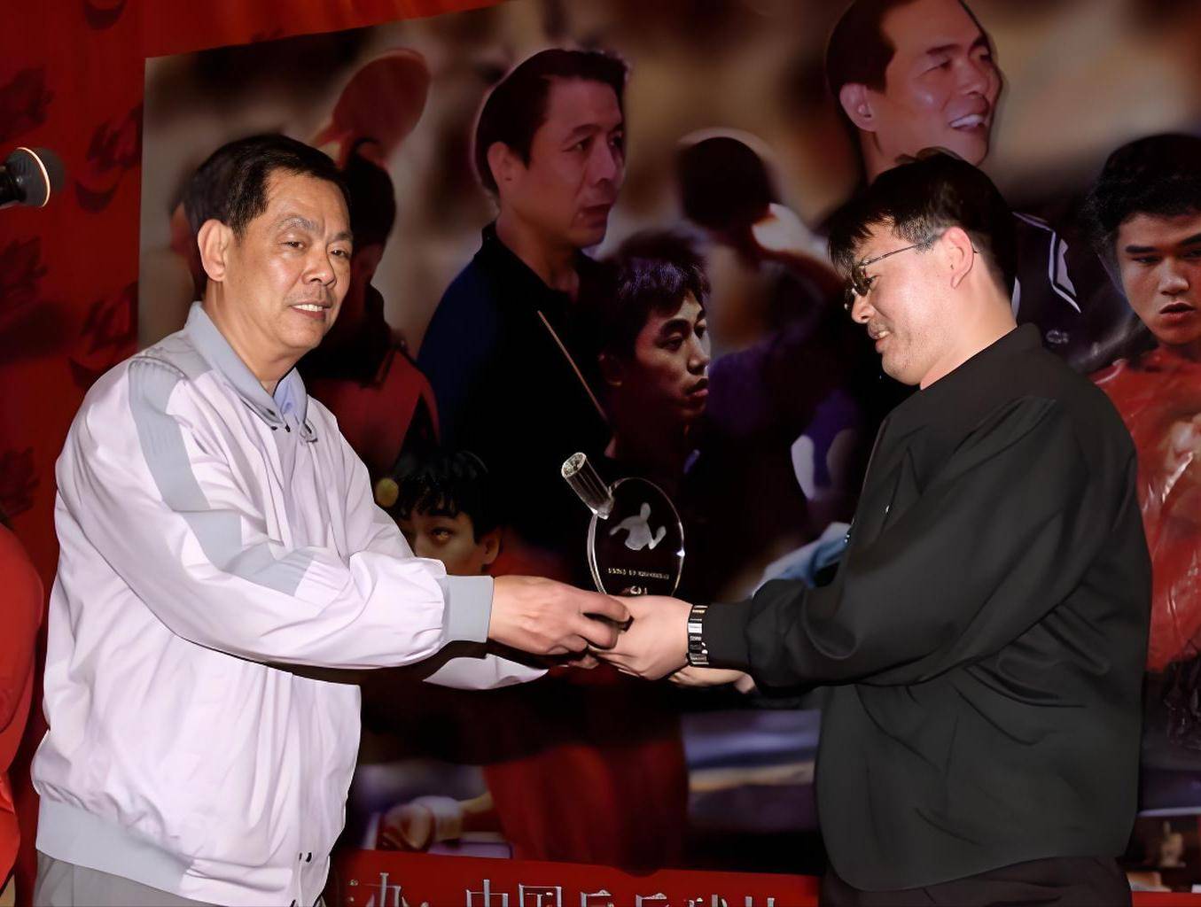 (2002年4月9日,中国乒乓球“双十佳”评选活动在京揭晓,最佳教练吴敬平(右)在发奖仪式上。)