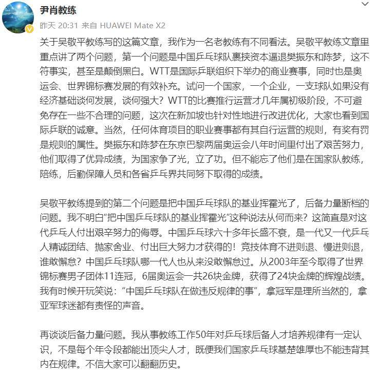 2025年2月15日,国家乒乓球队前著名教练尹肖在微博里发文,回应昔日同事吴敬平“关于最近乒坛乱象” 的文章。全文长达1292个字,而吴敬平的文章只有566个字。