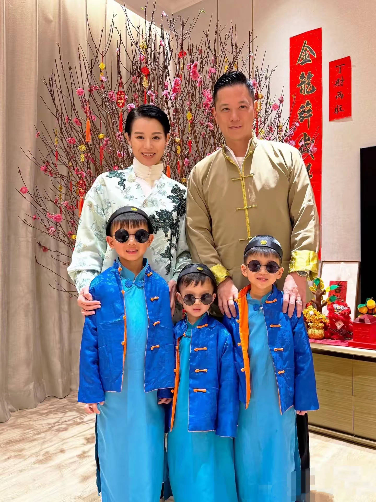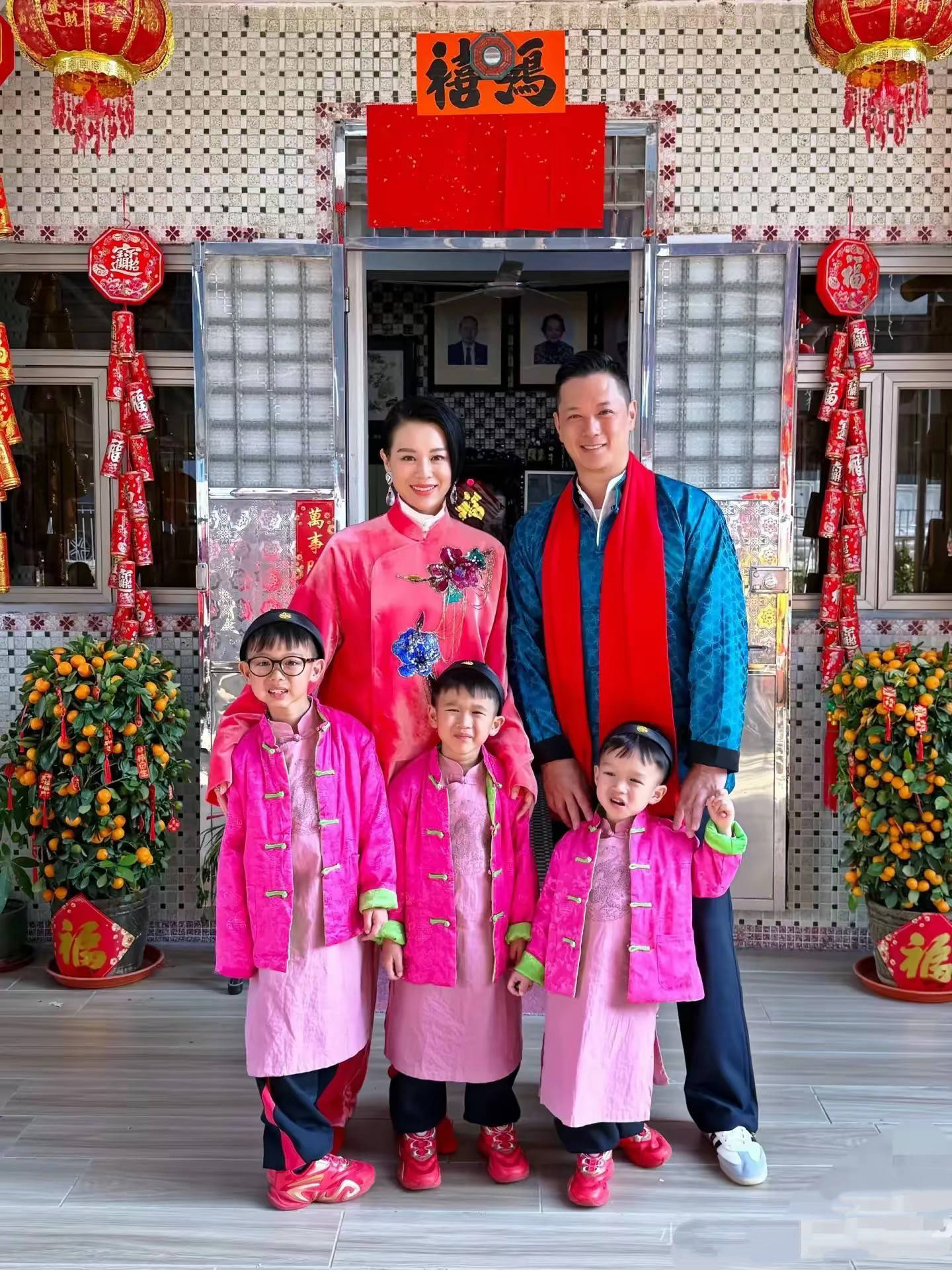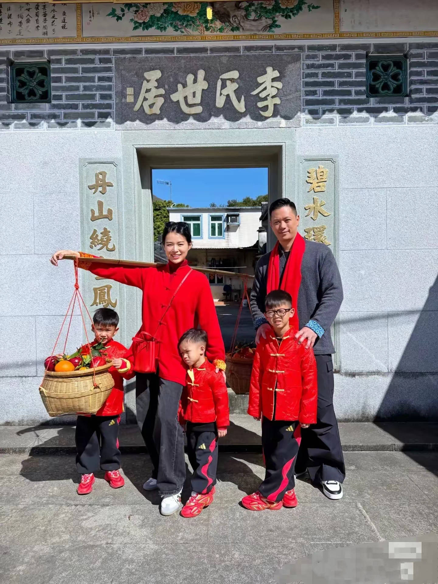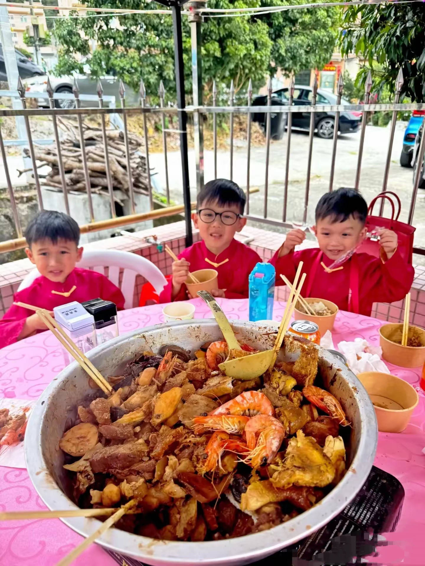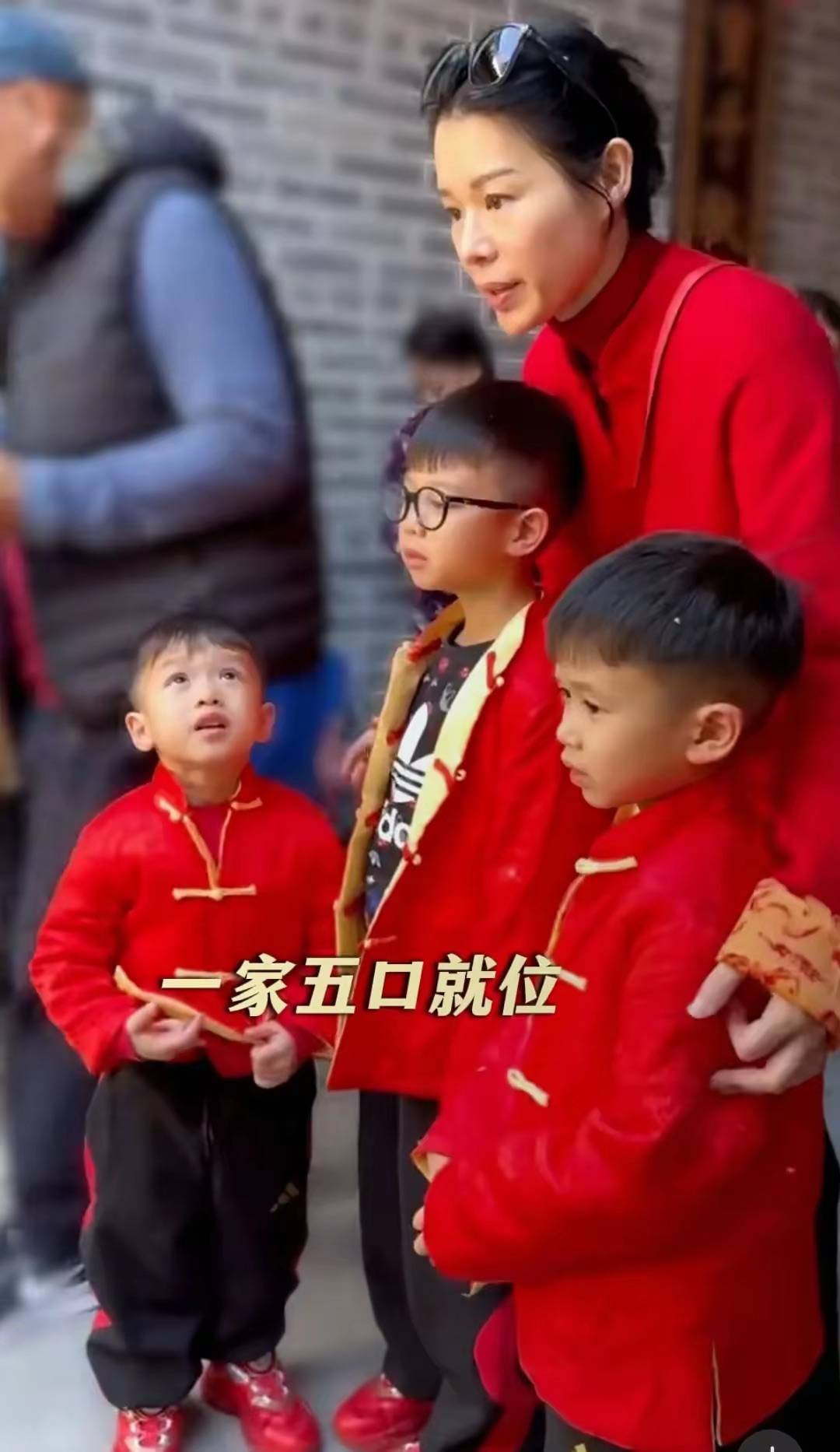 他们穿着整整齐齐的,红色的客家服饰特别喜庆。三个儿子穿同款的上衣、可可爱爱的,年味这不就来了吗?