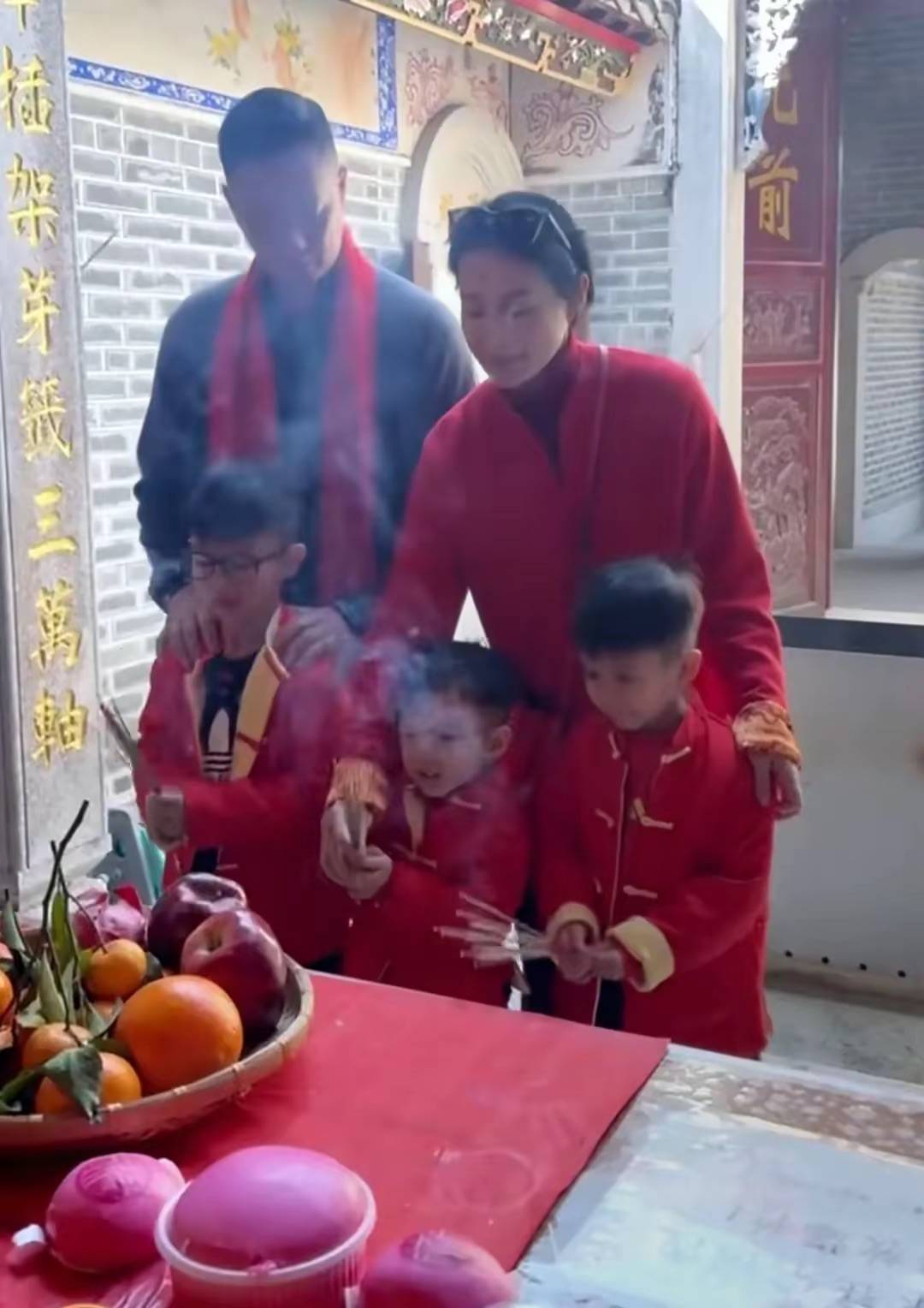 一家人祭祖,就是要整整齐齐的。在外是大明星,回到村子里就是客家媳妇。胡杏儿带着三个儿子准备就位、马上就要开始祭祖仪式了。