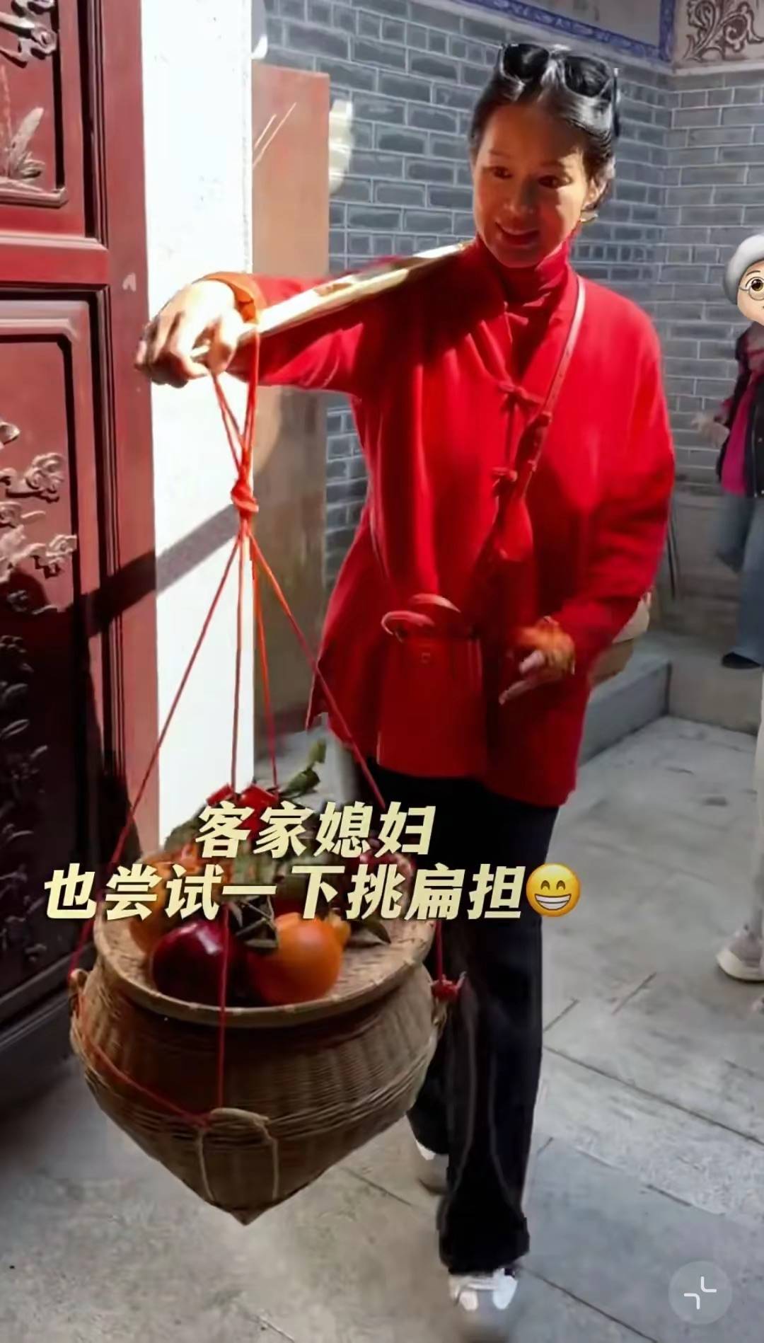 除了祭祖上香,胡杏儿还体验了客家媳妇的技能——挑扁担。胡杏儿还挺厉害的,挑起扁担来并没有左摇右晃的,挺有那么个意思呢。