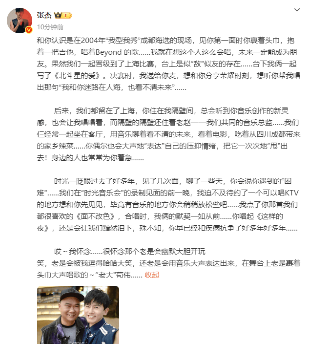 和你认识是在2004年“我型我秀”成都海选的现场,见你第一面时你裹着头巾,抱着一把吉他,唱着Beyond 的歌……我就在想这个人这么会唱,未来一定能成为朋友。果然我们一起晋级到了上海比赛,台上是似“敌”似友的存在……台下我俩一起写了《北斗星的爱》。决赛时,我递给你麦,想和你分享荣耀时刻,想听你帮我唱出那句“我和你迷路在人海,也看不清未来”……