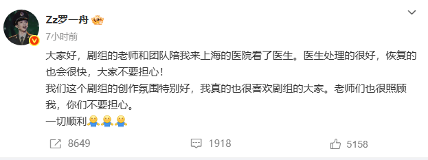 经过初步处理后,由于需要进一步诊疗,罗一舟被转至上海专科医院。6月26日凌晨,他通过社交平台发文,向关心他的粉丝们报平安。他表示,医生处理得很好,恢复也会很快,并感谢剧组老师和团队的照顾。同时,他还特别提及了剧组的创作氛围十分融洽,字里行间满是对剧组同仁的喜爱之情。