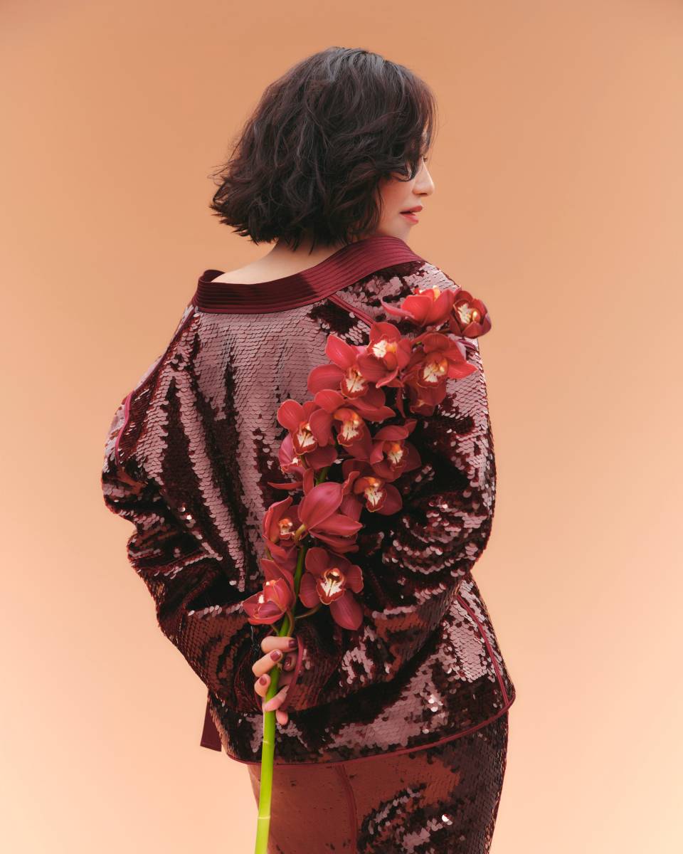 裙装的剪裁堪称点睛之笔。利落的宽肩设计延续了她标志性的英气,却在腰际以微妙的收束线条,悄然过渡出女性的柔婉曲线,恰如她在银幕上塑造的角色,刚柔相济且层次分明。裙摆随着步履轻晃,露出的纤细脚踝踩着镶钻高跟鞋,每一步都踏出从容的韵律,背影望去,肩胛骨的流畅弧度与腰臀间的窈窕轮廓,将 “风骨” 二字诠释得淋漓尽致。手中那支盛放的红花并非刻意点缀,暗红花瓣与裙身色调形成温柔呼应,为端庄造型注入自然生机,宛如时光在她身上绽放的鲜活印记。