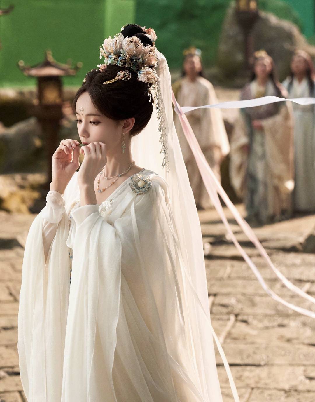 这份美感源于细节的精妙平衡,是“增一分则艳,减一分则淡”的恰到好处。她的妆容摒弃了当下古装剧常见的浓眼影、粗眼线,仅以薄如蝉翼的淡粉提亮双颊,仿佛是自然透出的好气色;眼妆上,化妆师用深棕色眼线笔在眼尾轻轻上扬一分,既勾勒出灵动弧度,又不会显得夸张,完美保留了少女的鲜活感,同时契合古装造型所需的温婉气质。最动人的莫过于眼神中藏不住的层次,镜头前她时而垂眸浅笑,睫毛在眼下投下细碎的阴影,眼波温柔得如同三月江南的春水,能溺毙人心;时而抬眼望向前方,瞳孔微微睁大,灵动的眸光里藏着几分孩童般的娇憨,这种“静时温婉,动时灵动”的刚柔并济,恰是中式美人“静如处子,动如脱兔”的生动诠释,让人想起《诗经》中“巧笑倩兮,美目盼兮”的经典描写,将东方女性的韵味展现得淋漓尽致。