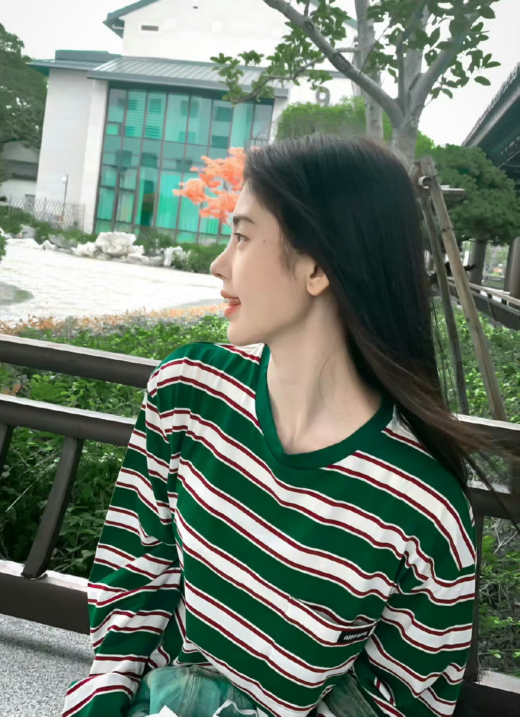 整套穿搭的点睛之笔,藏在细节与色彩的碰撞之中,看似不经意的搭配实则处处透着巧思。她特意打造的正红色美甲,如同在柔和的条纹色系中投入一束鲜活的亮色,瞬间打破了整体造型的沉闷感。指甲被精心修剪成圆润的方圆形,这种甲型既能修饰手指线条,让指尖显得纤细修长,又比尖锐的方甲多了几分亲和力,甲型饱满精致,红得均匀透亮,没有多余的装饰图案,纯粹的色彩反而更具视觉冲击力。当她轻握树叶时,正红色美甲与翠绿的叶片形成鲜明的冷暖对比,与灰蓝条纹的柔和形成张力,让整体造型瞬间跳出单调。