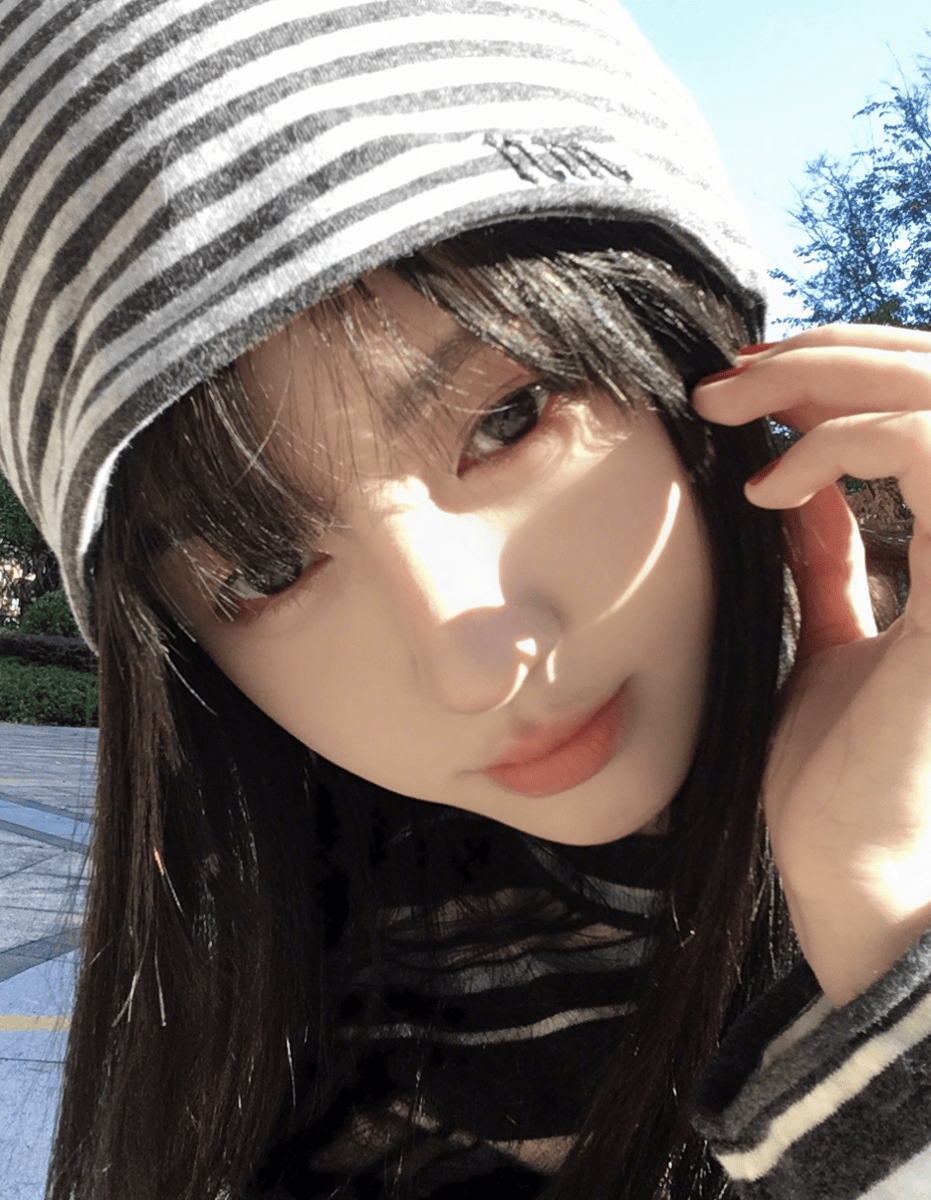 树林背景与穿搭的高度适配,更让这组照片摆脱了摆拍的生硬感,充满了自然的故事感。斑驳的阳光透过层层叠叠的树叶缝隙洒下,在她的条纹衣料上形成明暗交错的光影效果,原本规整的条纹被光影切割后,呈现出流动的韵律感,灰蓝色调在暖融融的自然光照射下,更显柔和温润,与周围深浅不一的绿色植被形成和谐的色彩层次,从浅绿的新叶到深绿的老叶,再到灰蓝条纹的衣身,色彩过渡自然又富有层次。照片中,她的姿态各异却都透着随性:侧身站立时,帽衫的连帽轻轻搭在肩头,帽绳自然垂落,衣摆随着身体的角度自然垂落,勾勒出柔和的曲线;转身回眸时,她微微歪头,一手轻扶树干,帽衫的袖口滑落少许,露出小臂的纤细线条;脚下随意摆放着一双白色板鞋,鞋边没有刻意擦拭得一尘不染,带着些许生活气息,与整体造型的休闲感完美契合。这种将穿搭与自然环境深度融合的思路,打破了日常随拍“背景虚化、只拍人像”的单调模式,让人物与环境相互成就,每一张照片都像生活场景中的美好切片,仿佛下一秒就能看到她踩着落叶走向镜头,脚步声与树叶的沙沙声交织在一起。