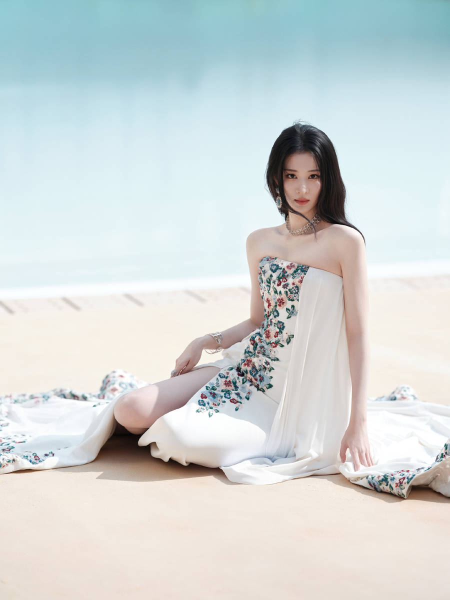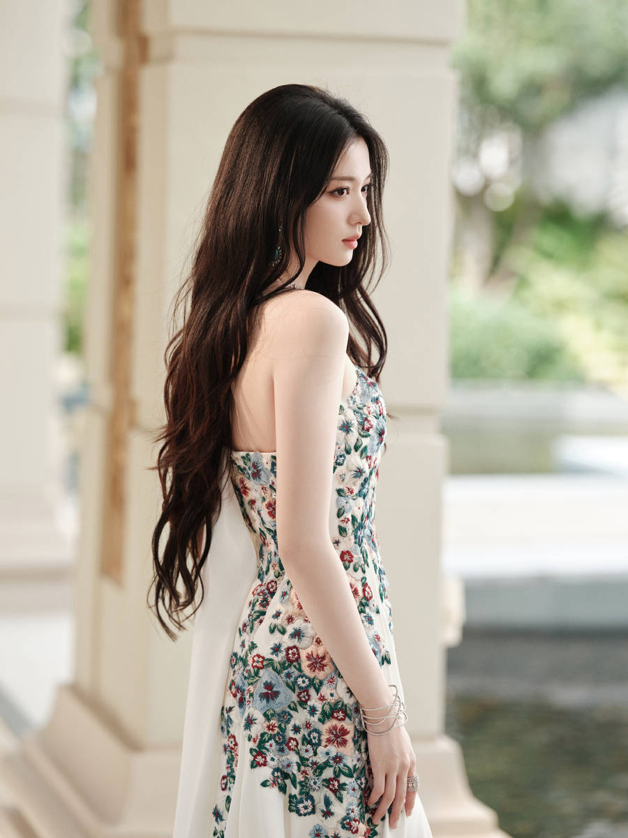 造型的精妙之处,更藏在那些“于无声处见匠心”的细节把控中。裙身采用简约的抹胸设计,没有多余的蕾丝堆砌,仅以流畅的剪裁勾勒出她优越的肩颈线条——斜方肌线条平滑,锁骨呈自然的蝴蝶骨弧度,与她清冷中带着温柔的面部轮廓相得益彰,避免了抹胸款式常见的“生硬感”;腰间暗藏的隐形束带是点睛之笔,既没有破坏裙身花卉纹样的完整性,又巧妙凸显出纤细腰线,让她172cm的高挑身形优势尽显,裙摆自然垂坠至脚踝,行走间裙摆轻扬,如同流动的花影。