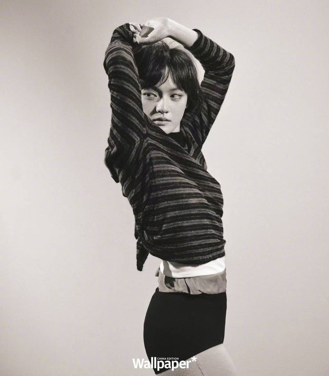 大片的视觉冲击力藏在极致反差里。最惊艳的黑白镜头中,文淇穿修身款黑白条纹针织衫,领口随意翻折露出纤细脖颈,线条利落的下颌线在光影中格外清晰。她侧身而坐,一手轻抵下巴,眼神不直视镜头却自带穿透力,既没有少女的娇憨,也不见刻意的凌厉,那种介于青涩与成熟间的混沌感,恰似她在《血观音》里饰演的棠真,用稚气脸庞藏着复杂心事。另一组造型里,她裹着灰色oversize毛绒外套,蓬松面料衬得身形愈发娇小,却在抬手整理衣领时,指尖不经意流露出掌控感。