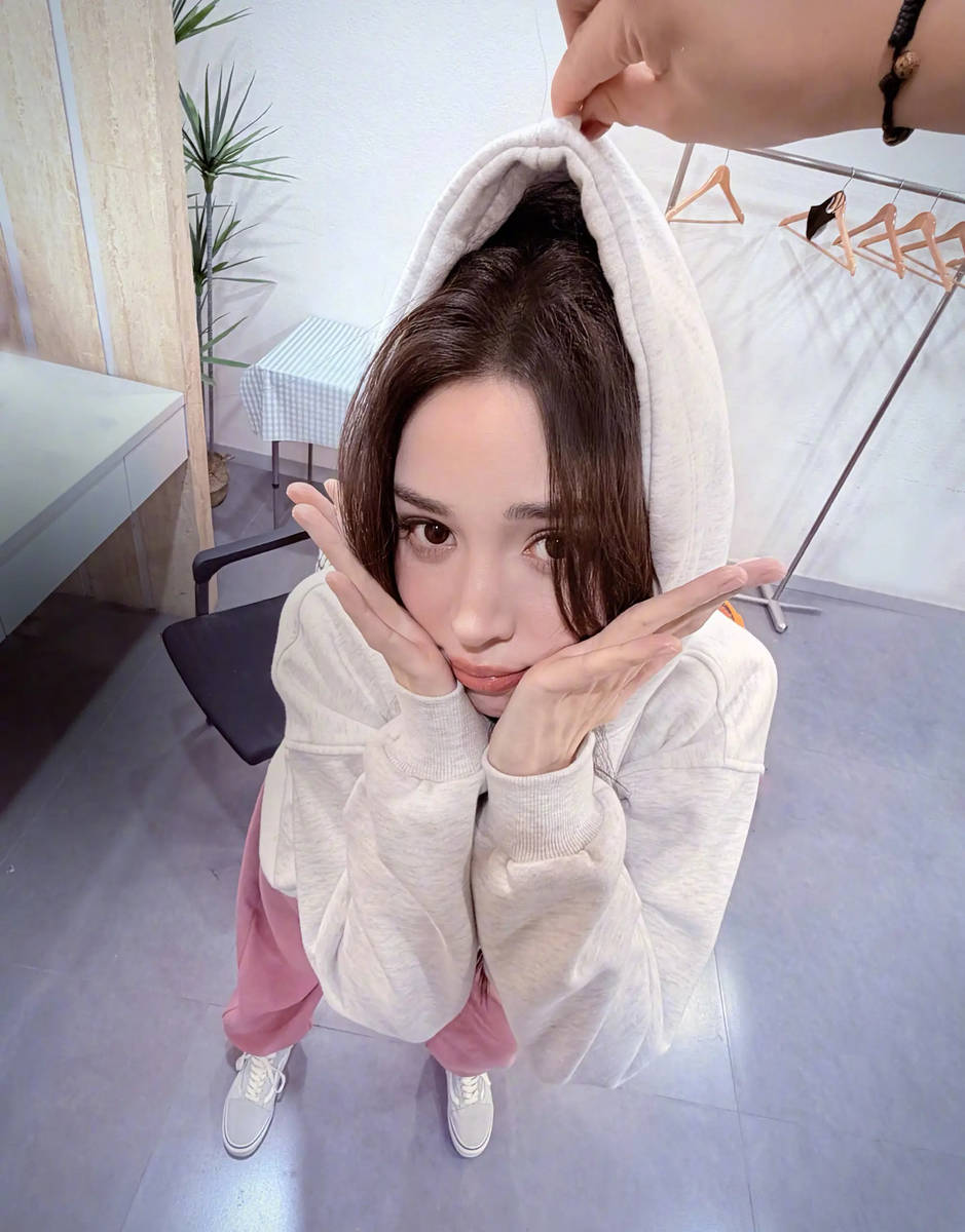 提及古力娜扎,多数人首先想到的是她在影视作品中塑造的御姐形象,或是红毯上光彩照人的惊艳瞬间。深邃的五官、高挑的身材,自带一种距离感的冷艳美,这让她在古装剧《轩辕剑之天之痕》中的小雪一角深入人心,也让她在时尚领域备受青睐。然而,此次营业美照却彻底打破了这种固有印象——白色卫衣搭配粉色裤子,清新明快的色彩组合弱化了她五官的攻击性,拎帽拍摄的角度缩短了视觉比例,让她的脸庞显得愈发小巧精致,嘟嘴卖萌的神态更是将“反差萌”发挥到了极致。这种从“高冷女神”到“萌娃手办”的转变,并非刻意营造,而是源于她骨子里的灵动与自然。
