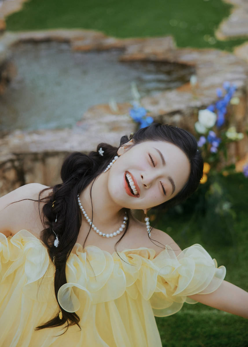 珍珠饰品的搭配堪称点睛之笔,让甜美元气中更添一份精致温婉。简约的珍珠耳饰与细巧的珍珠项链相互呼应,没有过分堆砌的华丽感,却以温润的质感中和了黄色的明亮感,让整体造型更显典雅得体。配饰的简约风格与礼服的简约设计形成和谐统一,既符合盛典场合的正式感,又不会掩盖沈月自身的甜美元气质感。而她的妆容选择同样贴合整体造型,清透的裸妆凸显五官优势,自然的眉形、淡雅的眼妆搭配元气满满的唇色,让托腮甜笑的瞬间更显娇俏动人,将“灵动仙气”的氛围精准传递。