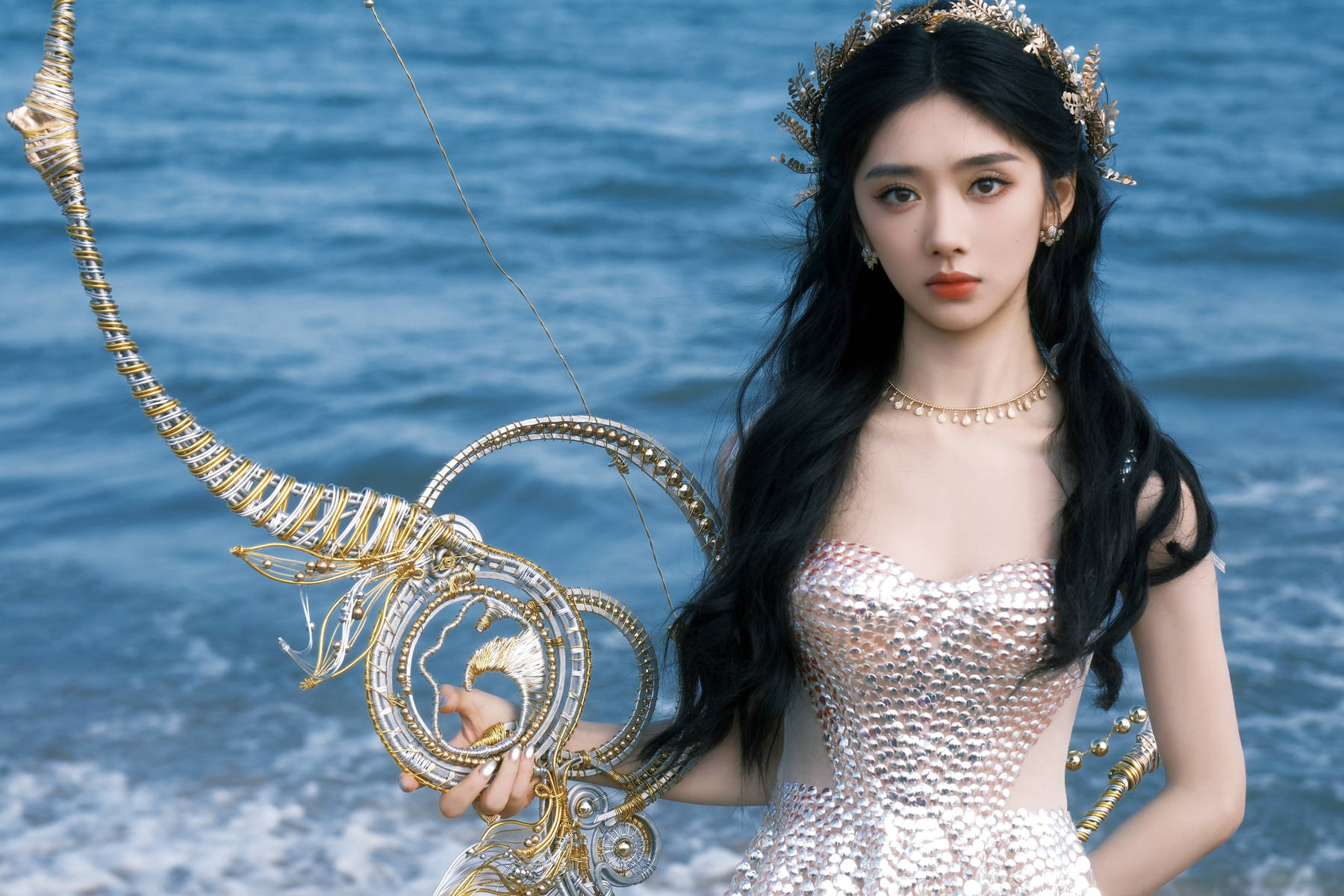 “神女”造型的精准落地,首先源于服饰与配饰的意象协同。浅色亮钻纱裙作为造型的核心载体,摒弃了繁复的色彩堆砌,以纯净的浅色为基底,缀满的亮钻在灯光下折射出细碎光芒,宛如星河洒落裙摆,既契合“神女”的圣洁感,又不失少女的灵动。纱裙的剪裁兼顾了飘逸感与仪式感,裙摆的层叠设计让行走间自带仙气,而修身的上身版型则精准勾勒出曼妙身姿,避免了宽松纱裙的臃肿感。头戴的金冠更是点睛之笔,简约而不失精致的纹样设计,既强化了“神女”的尊贵感,又没有抢夺服饰的风头,与亮钻纱裙形成质感互补。手持弓箭的道具搭配,更让造型跳出了单纯的“美”,增添了几分神性的坚毅与力量感,让“神女”形象更加丰满立体。