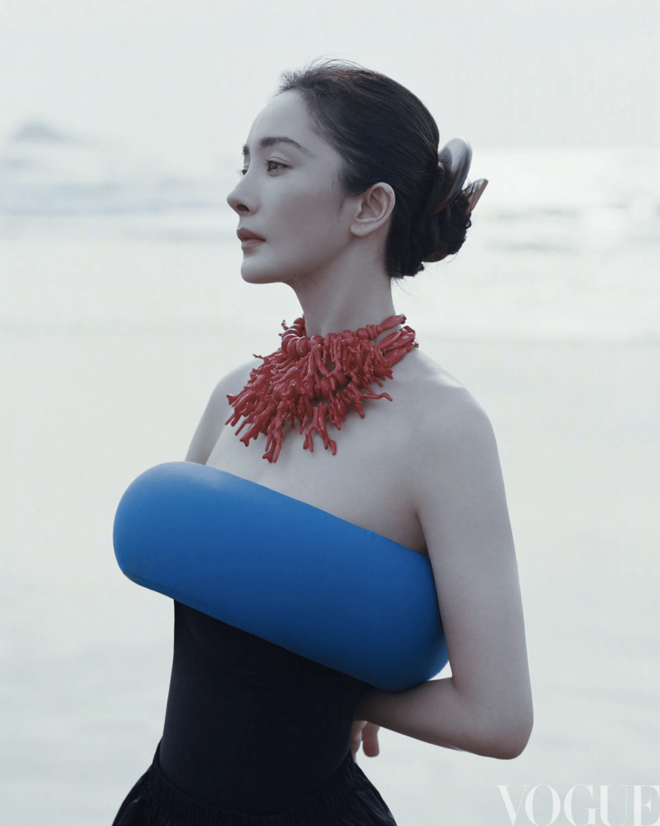 场景与造型的精准适配,是这组封面大片成功的核心密码。海边作为核心拍摄场景,自带自由、辽阔的气质,而杨幂的多套造型则与这一气质形成了巧妙的呼应与互补。当她化身海边女骑士骑乘白马立于海边时,紫纱裙摆随风轻扬,将“骑士”的飒爽与“海边”的浪漫完美融合,紫纱的柔美中和了骑士形象的硬朗,海风的吹拂则让整体造型更具动态美感,仿佛一位从海浪中走来的自由使者。立于船边时,她选择简约造型,利落的线条衬得身姿纤细灵动,与船舷、海水构成简洁干净的画面,凸显出“less is more”的时尚哲学,将海边的静谧与从容诠释得淋漓尽致。而躺卧于布景中时,暖调造型与柔和的自然光相互映衬,衬得神态慵懒舒展,与海边午后的惬意氛围无缝衔接,让画面充满治愈感。