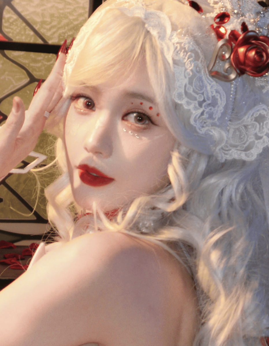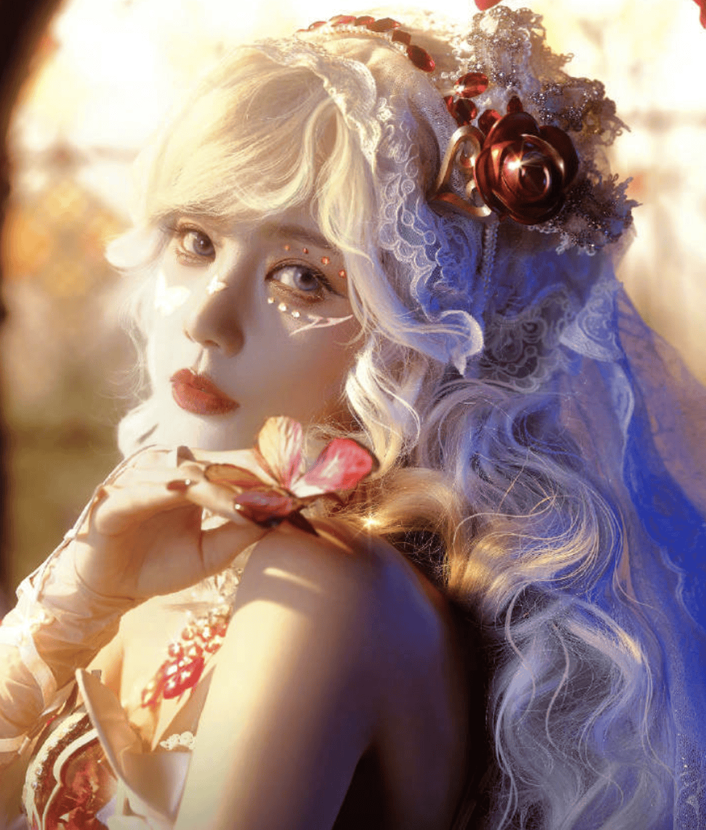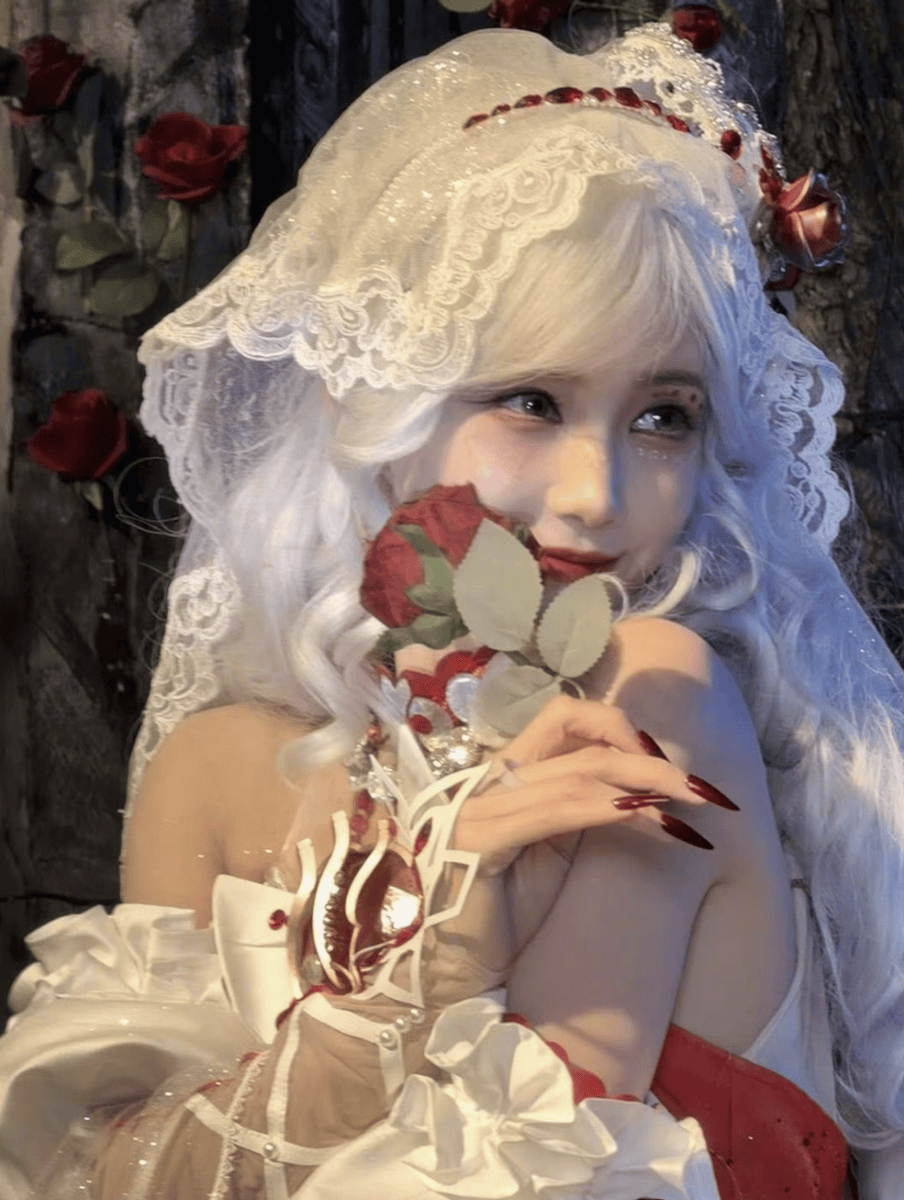 红裙与红玫瑰的点缀,为造型注入了热烈的甜艳气息,与白发形成强烈的视觉张力。红裙选用饱和度恰到好处的正红色,既不过于刺眼,又足够明艳动人,修身的剪裁完美勾勒出流畅的身材曲线,展现出女性的娇俏与灵动。裙摆的设计轻盈飘逸,行走间随风微动,宛若花仙子翩翩起舞,进一步强化了童话氛围。而作为配饰的红玫瑰,无论是别在发间还是点缀在裙摆,都与红裙形成呼应,让整体造型更加统一协调。红色与白色的经典搭配,在视觉上形成强烈对比,既凸显了白发的独特质感,又让红裙的甜艳更加突出,这种“冷与热”“柔与刚”的碰撞,让造型极具记忆点,每一张照片都充满视觉冲击力。