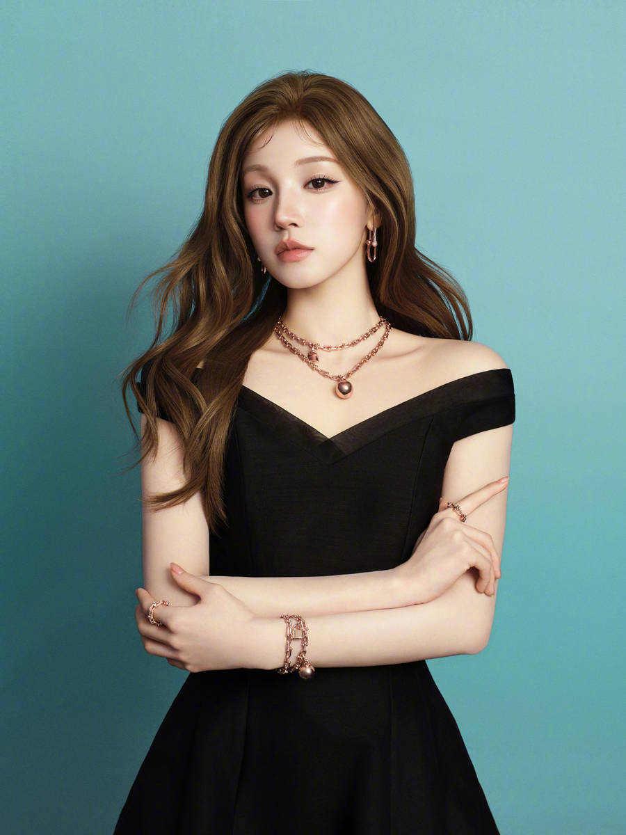 珠宝搭配更是锦上添花,与黑色礼服形成完美呼应,进一步提升了整体造型的贵气感。宋雨琦选用一套玫瑰金珠宝,包括项链、耳环与手链,设计简约精致,没有多余的繁杂装饰,仅以细碎的钻石点缀,低调中透着奢华。玫瑰金的温柔色调,中和了黑色礼服的冷艳气场,让整体造型变得柔和而有层次,项链贴合颈线,耳环修饰脸型,手链点缀手腕,与露肩礼服相互映衬,既凸显了珠宝的精致,又不会喧宾夺主,尽显优雅贵气。