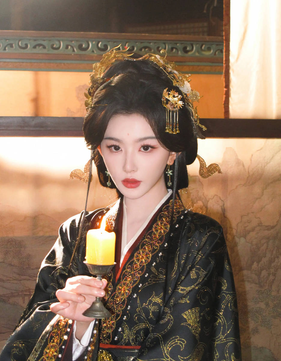 这组剧组花絮主打沉浸式拍摄氛围感,背景贴合古风场景,昏暗的光线搭配古色古香的陈设,没有过多繁杂的装饰,更能凸显出孔雪儿黑色汉服的质感与自身的强大气场。光线运用极具巧思,微弱的烛光与环境光相互映衬,洒在她的汉服上,让黑色面料折射出细腻的光泽,既增添了几分神秘氛围感,又让汉服的细节得以清晰展现,与她手持的烛台形成呼应,仿佛一秒穿越到古风剧情之中,代入感十足。